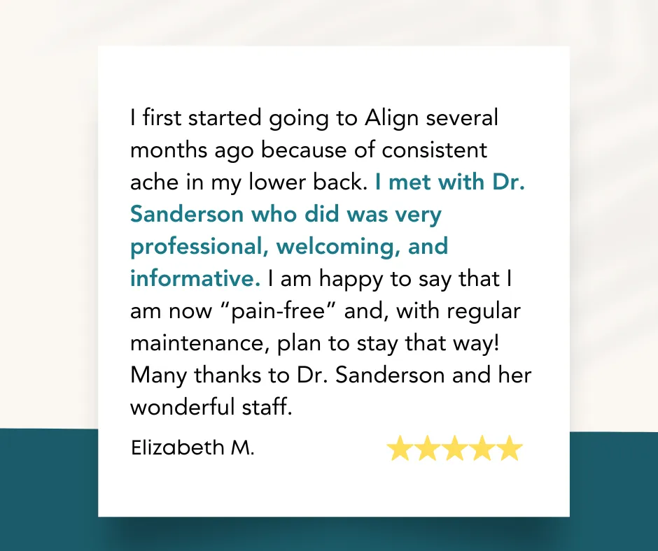 Hi, I’m Dr. Marcy Sanderson, CEO and founder of Align Health Centre. I'm so glad you're here! Ready to take the next step? Click the button below to view my calendar and book a time that works best for you.
